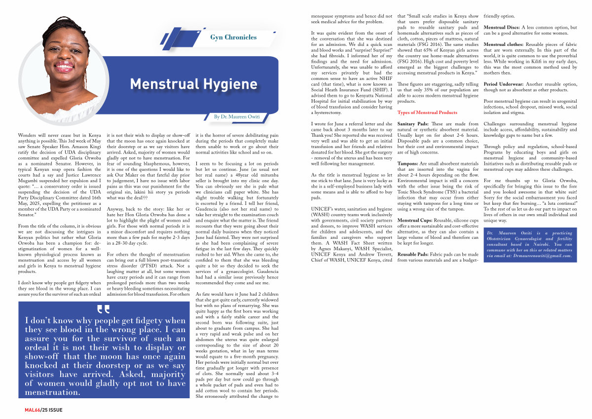 Dr. Maureen Owiti is a practicing Obstetrician Gynaecologist and fertility consultant based in Nairobi. You can commune with her on this or related matters via email at: Drmaureenowiti @ gmail. com.
