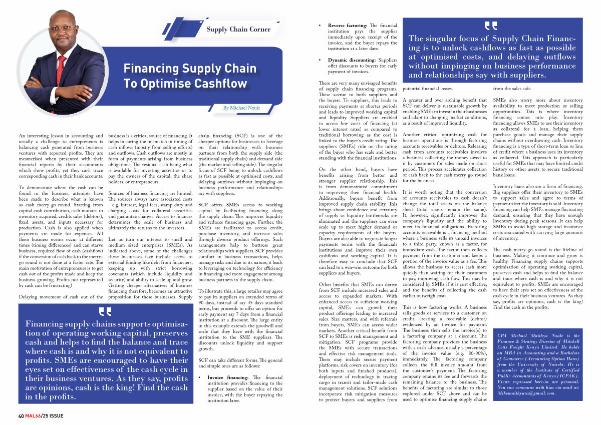 CPA Michael Maithya Nzule is the Finance & Strategy Director of Mitchell Cotts Freight Kenya Limited. He holds an MBA in Accounting and a Bachelors of Commerce( Accounting Option Hons) from the University of Nairobi. He is a member of the Institute of Certified Public Accountants of Kenya( ICPAK). Views expressed here-in are personal. You can commune with him via mail at: Mikemaithyanz @ gmail. com.