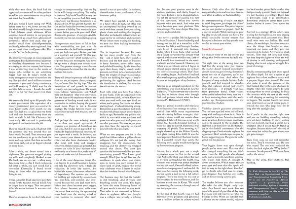 Entrepreneurs must learn to fall in love with sustainability, not just scale. Be cautious when the deal looks too good and your gut feels too quiet. Before you take on a contract, ask yourself:“ If this goes south, do I survive?” Don’ t mistake access to power for access to integrity. And never let ego write a cheque your systems can ' t cash. The greatest strategy is not the one that impresses the crowd but the one that outlives the storm.