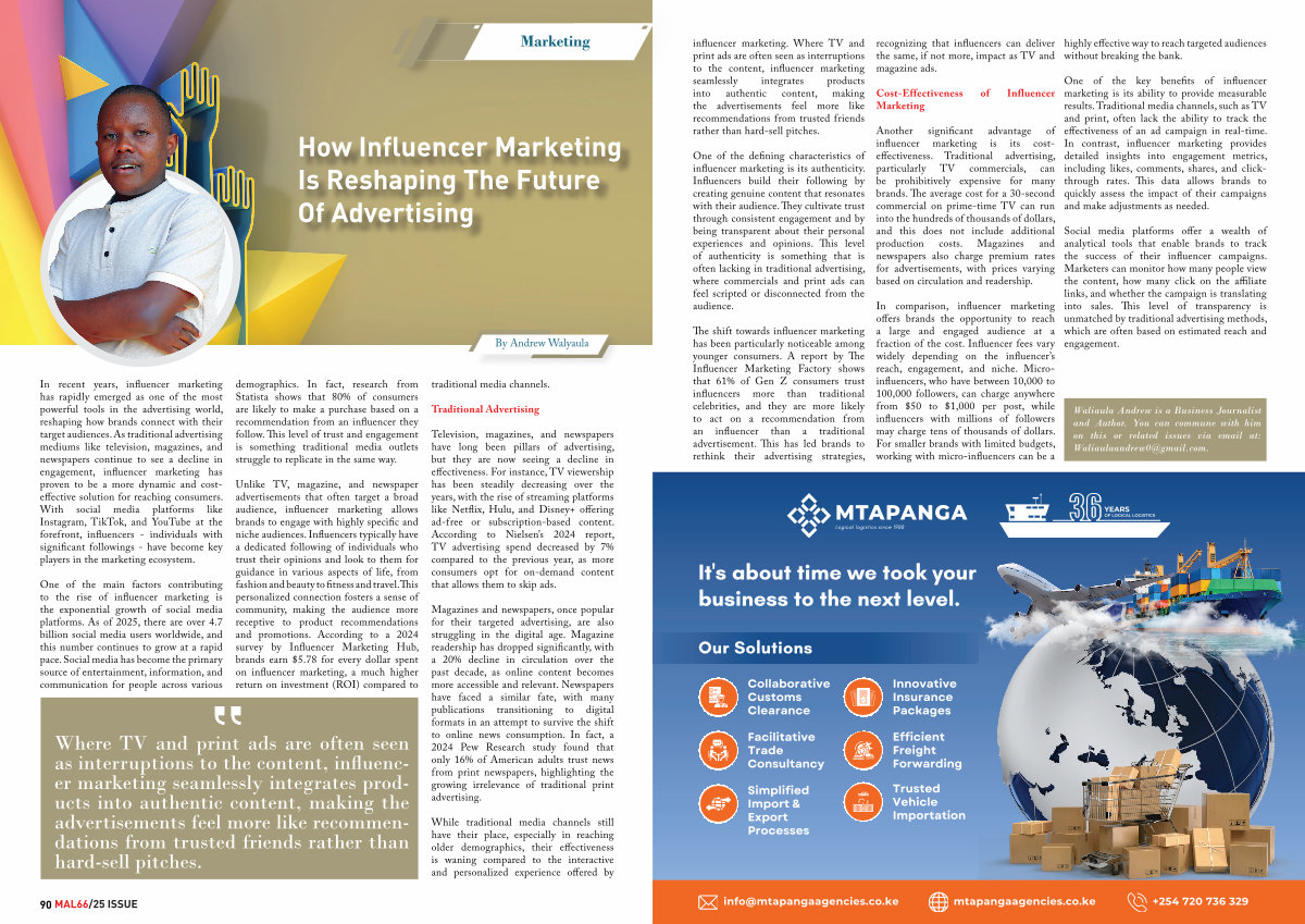In recent years, influencer marketing has rapidly emerged as one of the most powerful tools in the advertising world, reshaping how brands connect with their target audiences. As traditional advertising mediums like television, magazines, and newspapers continue to see a decline in engagement, influencer marketing has proven to be a more dynamic and costeffective solution for reaching consumers. With social media platforms like Instagram, TikTok, and YouTube at the forefront, influencers- individuals with significant followings- have become key players in the marketing ecosystem.
