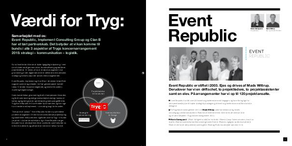 Samarbejdet med os: Event Republic, Implement Consulting Group og Clan B har et tæt partnerskab. Det betyder at vi kan komme til bunds i alle 3 aspekter af Trygs koncernarrangement 2015: strategi – kommunikation – logistik.
