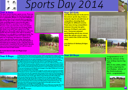 This year's Sports Day was a great success. There was lots of events throughout the day that were won by a lot of competitive athletes. In 100m Kate Wilkinson won with a time of 14.6 seconds-this is a very fast time for the girls. In the 200m race Sophie Ekstrom-Gabb and Bridget Morris came joint first with a fantastic time of 32 seconds. In 1500m Eleanor Houlston Clark came first with a time of 6 minutes and 50 seconds. Shot put was won by Emily Adams she threw 6.12m which was a great score. Meg Bhoghal won discus with a great distance of 16.95m. Javelin was won by Katie Jones with an excellent distance of 20.12m which is a really good result. The remaining competitions were also a great success with lots of winnings off numerous competitors. Cadoc came first in this year's relay- they had an impressive time of 61.8 seconds beating Illtyd(63.4) Patrick(66.8) and Teilo(64.4). Also a big well done to everyone who competed in this year's sports day who may not have been mentioned but still had a good turnout in each of their events.