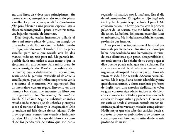 A los pocos días ingresaba en el hospital por una mala praxis médica . Una simple endoscopia había desencadenado una hemorragia interna , de esas silenciosas que pasan desapercibidas si no estás atenta a las señales de tu cuerpo que te dice que no puede más , que vas a colapsar . Por si acaso , en vez de ir al trabajo te encaminas a urgencias , al hospital . Eso y un par de libros salvaron mi vida . Uno se titula 22 cartas extraordinarias . Me lo regaló una de mis adorables y muy queridas exalumnas , y ahora excelente profesora de inglés , con una emotiva dedicatoria : « Que tu gran corazón siga adentrándose así de bien , con ese modo tan cálido y poco invasivo en la esencia de los que sufren y padecen . Gracias por tus caricias desde el corazón cuando menos necesitaba palabras vacuas y miradas compasivas ». Nadie mejor que ella sabe dar caricias desde el corazón . Espero ver publicados muy pronto los cuentos que escribió para su niña desde lo más profundo de su ser .