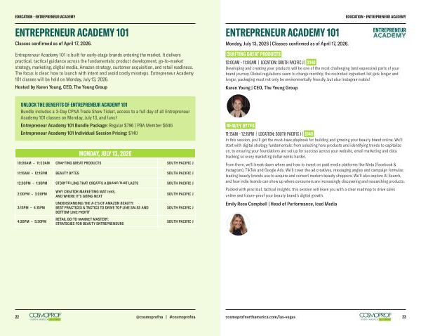 Entrepreneur Academy 101 is built for early-stage brands entering the market. It delivers practical, tactical guidance across the fundamentals: product development, go-to-market strategy, marketing, digital media, Amazon strategy, customer acquisition, and retail readiness. The focus is clear: how to launch with intent and avoid costly missteps. Entrepreneur Academy 101 classes will be held on Monday, July 13, 2026.