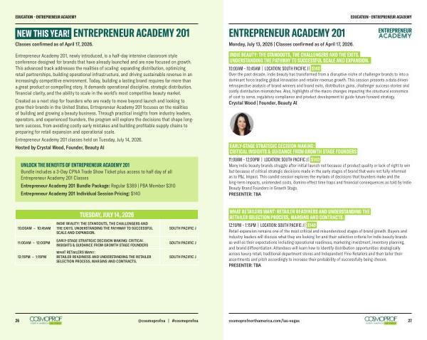 11:00AM – 12:00PM | LOCATION: SOUTH PACIFIC J | $ 140 Many indie beauty brands struggle after initial launch not because of product quality or lack of right to win but because of critical strategic decisions made in the early stages of brand that were not fully informed as to P & L Impact. This candid session explores the myriads of decisions that founders make and the long-term impacts, unintended costs, domino effect time traps and financial consequences as told by Indie Beauty Brand Founders in Growth Stage. PRESENTER: TBA
