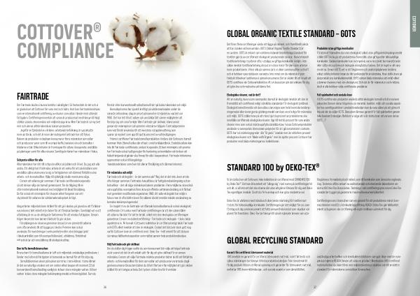 Ekologiska råvaror, vad är det? Att en naturlig råvara som exempelvis bomull är ekologisk innebär att den är framställd och certifierad enligt särskilda standarder för ekologiskt jordbruk. Ekologisk bomull innebär att den odlas utan några som helst kemiska bekämpningsmedel eller konstgjorda gödningsmedel som kan vara farliga för människa och miljö. GOTS ställer krav på att minst sjuttio procent av produkterna ska innehålla certifierade ekologiska råvaror. Upp till trettio procent får vara andra råvaror men som också måste uppfylla särskilda krav. I vissa Cottoverprodukter använder vi exempelvis återvunnen polyester för att göra materialet starkare. GOTS har två märkningsgrader där” Organic” innebär mer än nittiofem procent ekologiska råvaror och” Made with Organic” mer än sjuttio procent. Cottover har produkter med båda märkningarna i kollektionen.