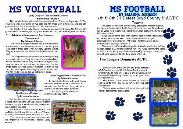 On October 6, the Lady Cougars hosted a game against Gregory. The 5th and 6th grade losts in three sets, the 7th grade won in two sets, and the 8th grade lost in two sets.