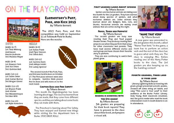 Literary Lightning Bolts (a traveling 4th grade group) presented acrostic poems, showed off some string art talent, and sang "This Land is Your Land" to their audience at the Burke Public Library. Jody Young, their classroom volunteer, was the guest reader who read the book A Halloween Scare in South Dakota to all in attendance.