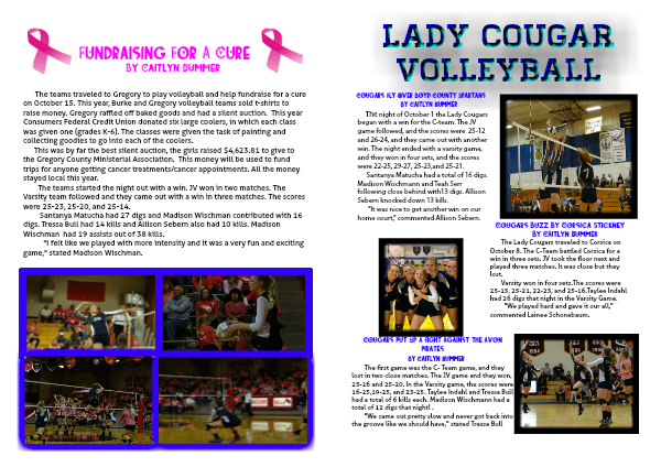 The night of October 1 the Lady Cougars began with a win for the C-team. The JV game followed, and the scores were 25-12 and 26-24, and they came out with another win. The night ended with a varsity game, and they won in four sets, and the scores were 22-25, 29-27, 25-23,and 25-21.