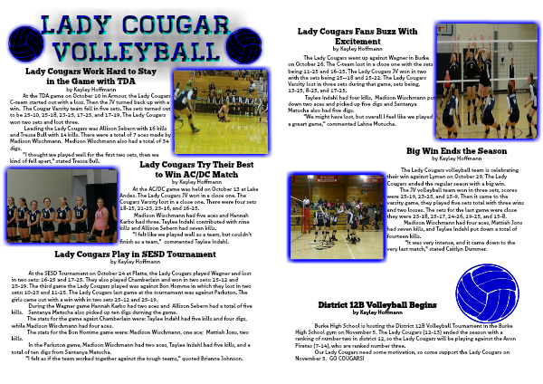 The Lady Cougars went up against Wagner in Burke on October 26. The C-team lost in a close one with the sets being 11-25 and 16-25. The Lady Cougars JV won in two with the sets being 25--18 and 25-22. The Lady Cougars Varsity lost in three sets during that game, sets being, 13-25, 8-25, and 17-25.