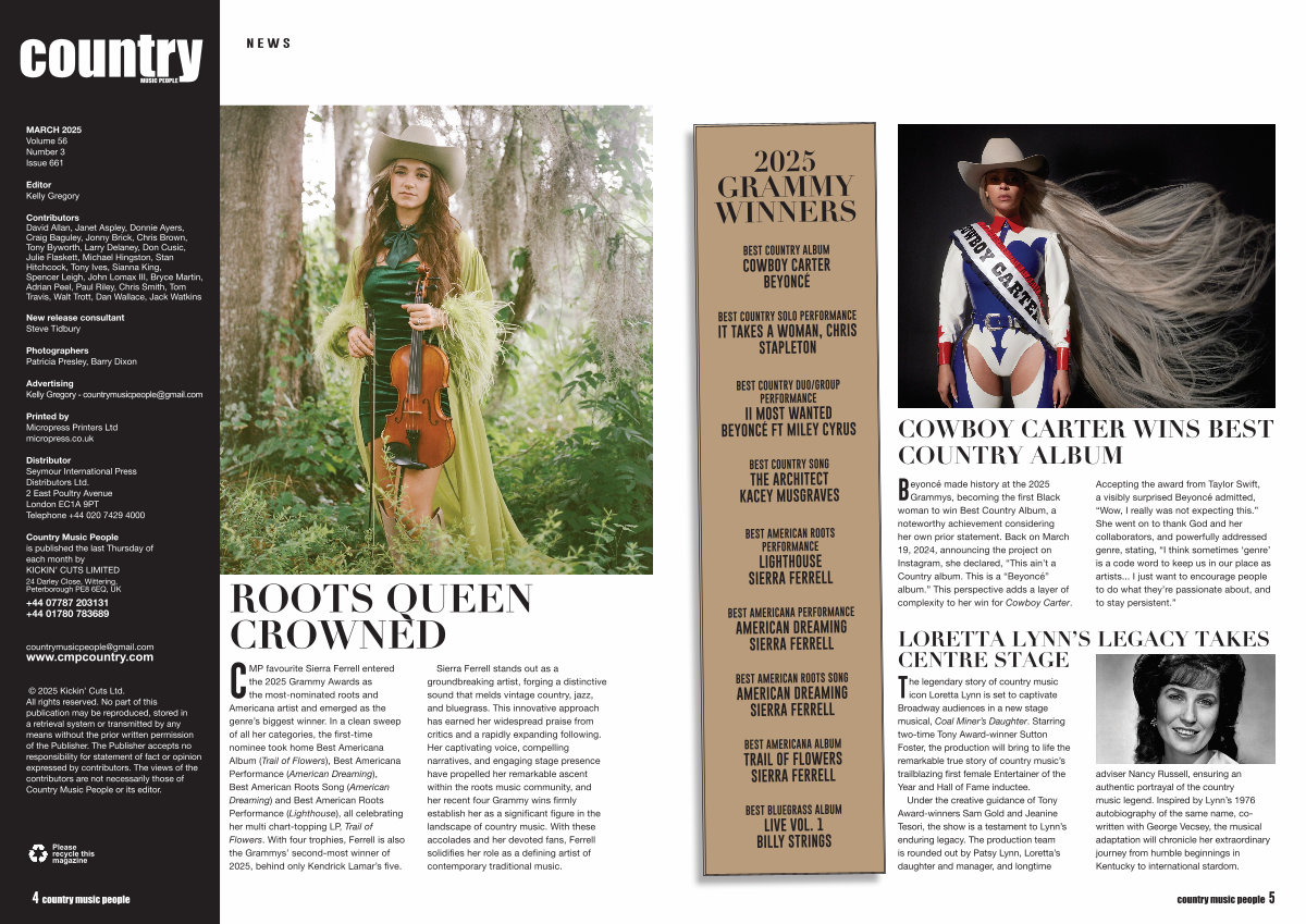 © 2025 Kickin ’ Cuts Ltd . All rights reserved . No part of this publication may be reproduced , stored in a retrieval system or transmitted by any means without the prior written permission of the Publisher . The Publisher accepts no responsibility for statement of fact or opinion expressed by contributors . The views of the contributors are not necessarily those of Country Music People or its editor .