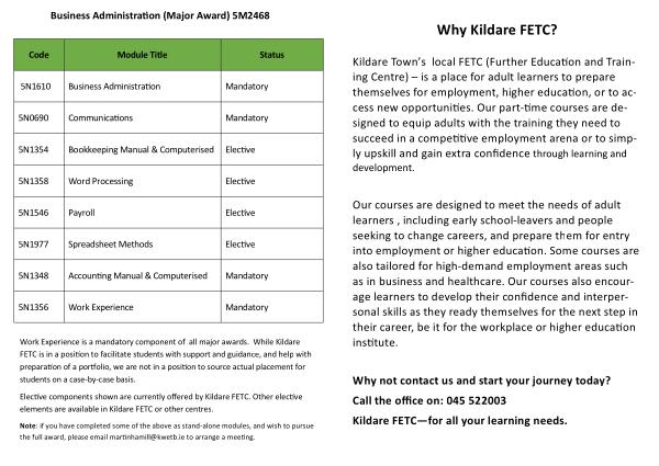 Elective components shown are currently offered by Kildare FETC . Other elective elements are available in Kildare FETC or other centres .