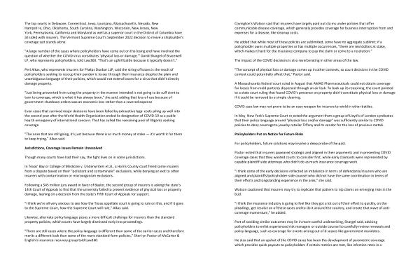 " I think some of the early decisions reflected an imbalance in terms of defendants / insurers who are aligned and plaintiffs / policyholder-side counsel who did not have the same coordination in terms of their efforts and longstanding experience in the area ," she said .