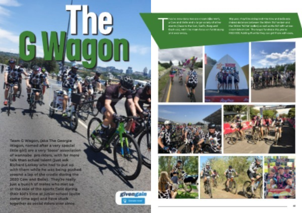 Team G Wagon , ( aka The Georgie Wagon , named after a very special little girl ) are a very ‘ loose ’ association of wannabe pro riders , with far more talk than actual talent ( just ask Richard Laskey who had to put up with them while he was being pushed around a lap of the cradle during the 2020 Cow and Belle ). They ’ re really just a bunch of mates who met up at the side of the sports field during their kid ’ s time at junior school ( quite some time ago ) and have stuck