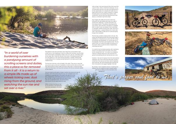 with our legs in the swimming pool they had carved into a bed of rocks . All this in that harsh landscape . It ’ s one of those places that has to be seen and experienced to be fully appreciated . Our campsite that night was on a beach down at the river , a piece of heaven in a setting like being back on the Orange River . Bonfire , steak , sundowners , and the milky way stretched end-to-end above us . Life doesn ’ t get more simple .