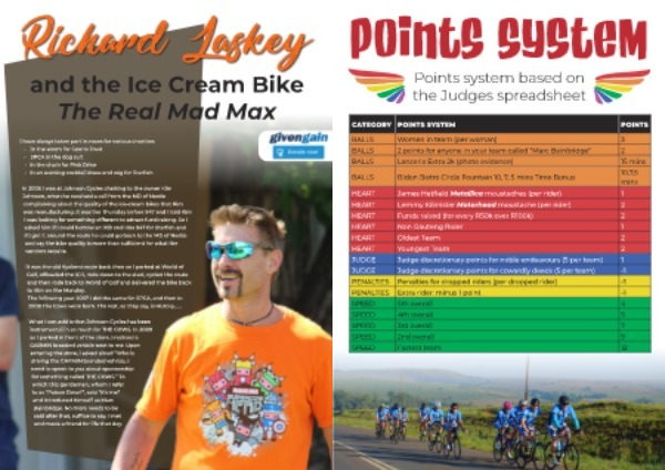 HEART James Hetfield Metallica moustaches ( per rider ) 1 HEART Lemmy Kilmister Motorhead moustache ( per rider ) 2 HEART Funds raised ( for every R50k over R100k ) 2 HEART Non Gauteng Rider 1 HEART Oldest Team 2 HEART Youngest Team 2 JUDGE Judge discretionary points for noble endeavours ( 5 per team ) 1 JUDGE Judge discretionary points for cowardly deeds ( 5 per team ) -1 PENALTIES Penalties for dropped riders ( per dropped rider ) -1 PENALTIES Extra rider : minus 1 point -1 SPEED 5th overall 4 SPEED 4th overall 5 SPEED 3rd overall 7 SPEED 2nd overall 9 SPEED Fastest team 12