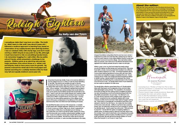 The family bike collection grew faster than n + 1 . Sturdy winter bikes with fixed gears and mudguards , shiny summer bikes with lightweight racing wheels . The acquisition of a tandem launched me fully into the cycling scene , snuggled up behind my dad , relinquishing control and embracing speed with the blind faith and adoration of a pre-teen . He referred to me as ‘ Turbo Boost ’, because of the sudden power surges from behind . I acquired my own cycling kit , replete with crusty chamois , woollen shorts and Sean Yates replica Peugeot cycling top . There were no transgender conversations back then , but I wanted to ride the Tour de France . As a dude . My role models , at this point , were all male . Suffice to say that it was a passing phase , and I am glad that nobody took me to therapy to unpack my identity issues . Cyndi Lauper has a fair point , “ Girls just want to have fun ”. Faced with the option of crippling stilettos or athletic gear , I ’ ve always opted to take the tow path rather than the runway . I have never looked back , since swapping the purple Raleigh Eighteen , with its basket of stuffed toys , for a red handbuilt racing bike . We still uphold the family tradition of ‘ morebikes-than-people ’ in our house in Cape Town . jvroohani @ gmail . com