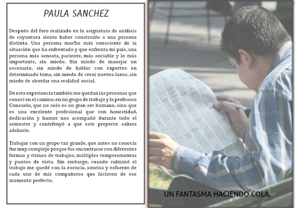 Después del foro realizado en la asignatura de análisis de coyuntura siento haber construido a una persona distinta. Una persona mucho más consciente de la situación que ha enfrentado y que enfrenta mi país, una persona más sensata, paciente, más sociable y lo más importante, sin miedo. Sin miedo de manejar un escenario, sin miedo de hablar con expertos en determinado tema, sin miedo de crear nuevos lazos, sin miedo de abordar una realidad social.