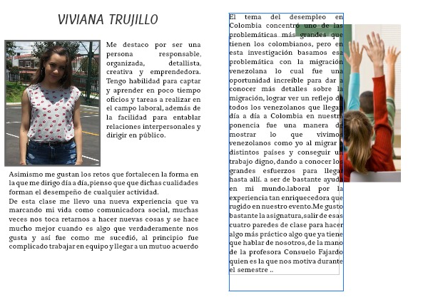 Me destaco por ser una persona responsable, organizada, detallista, creativa y emprendedora. Tengo habilidad para captar y aprender en poco tiempo oficios y tareas a realizar en el campo laboral, además de la facilidad para entablar relaciones interpersonales y dirigir en público.