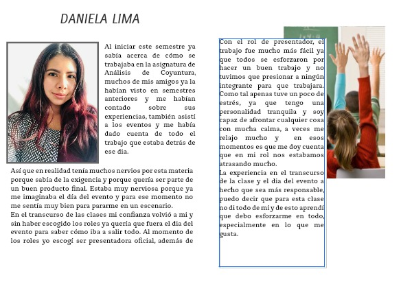 La experiencia en el transcurso de la clase y el dia del evento a hecho que sea más responsable, puedo decir que para esta clase no di todo de mí y de esto aprendí que debo esforzarme en todo, especialmente en lo que me gusta.