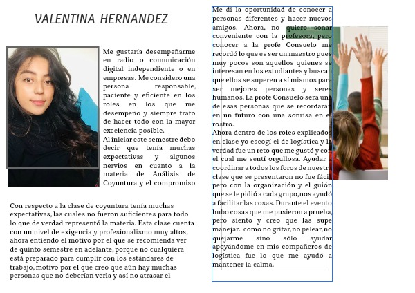 Me di la oportunidad de conocer a personas diferentes y hacer nuevos amigos. Ahora, no quiero sonar conveniente con la profesora, pero conocer a la profe Consuelo me recordó lo que es ser un maestro pues muy pocos son aquellos quienes se interesan en los estudiantes y buscan que ellos se superen a sí mismos para ser mejores personas y seres humanos. La profe Consuelo será una de esas personas que se recordarán en un futuro con una sonrisa en el rostro.