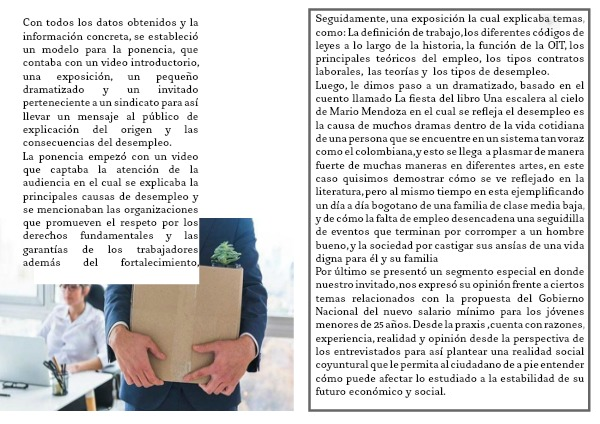 Con todos los datos obtenidos y la información concreta, se estableció un modelo para la ponencia, que contaba con un video introductorio, una exposición, un pequeño dramatizado y un invitado perteneciente a un sindicato para así llevar un mensaje al público de explicación del origen y las consecuencias del desempleo.