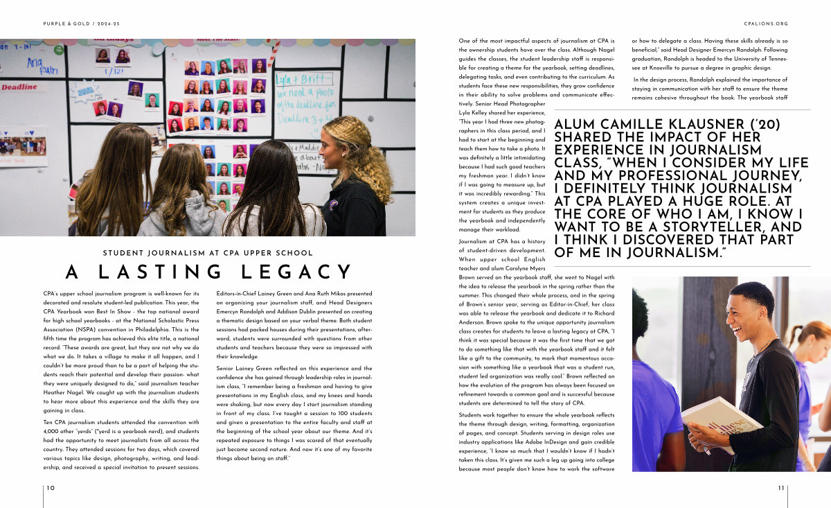 Journalism at CPA has a history of student-driven development. When upper school English teacher and alum Carolyne Myers Brown served on the yearbook staff, she went to Nagel with the idea to release the yearbook in the spring rather than the summer. This changed their whole process, and in the spring of Brown’ s senior year, serving as Editor-in-Chief, her class was able to release the yearbook and dedicate it to Richard Anderson. Brown spoke to the unique opportunity journalism class creates for students to leave a lasting legacy at CPA,“ I think it was special because it was the first time that we got to do something like that with the yearbook staff and it felt like a gift to the community, to mark that momentous occasion with something like a yearbook that was a student run, student led organization was really cool.” Brown reflected on how the evolution of the program has always been focused on refinement towards a common goal and is successful because students are determined to tell the story of CPA.