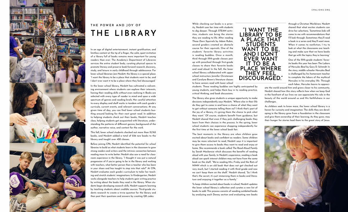 In an age of digital entertainment, instant gratification, and limitless content at the tip of a finger, the calm, quiet invitation of a library full of books remains more important for young readers than ever. The Academy’ s Department of Libraries services the entire student body, curating physical spaces to promote literacy and preserve book-forward research, discovery, study, and leisure in early childhood through adolescence. For lower school librarian Joni Nesbitt, the library is a special place:“ I want the library to be a place that students want to be, and I don’ t ever want it to be a place where they feel discouraged.”