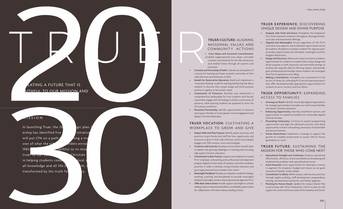 In launching Truer, the 2030 strategic plan, leadership has identified five strategic initiatives that will put CPA on a path to becoming a truer version of what the schools’ founders envisioned in 1985: a school that is faithful to its mission and truer to our call of assisting Christian families in helping students come to know God, evaluate all knowledge and all life by His truth, and live transformed by His truth for His glory.