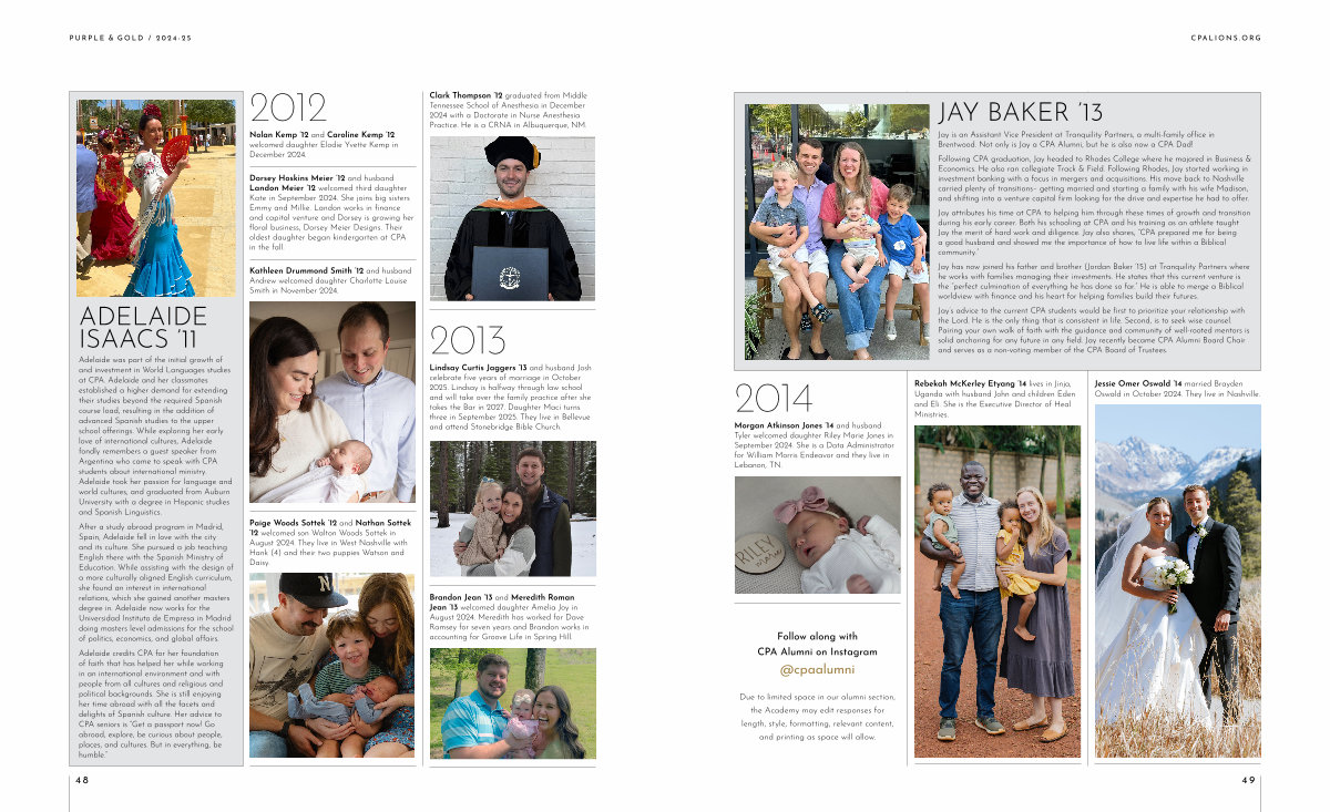 Brandon Jean’ 13 and Meredith Roman Jean’ 13 welcomed daughter Amelia Joy in August 2024. Meredith has worked for Dave Ramsey for seven years and Brandon works in accounting for Groove Life in Spring Hill.