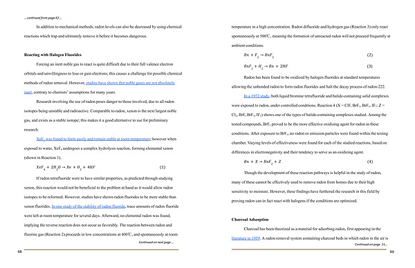 If radon tetrafluoride were to have similar properties, as predicted through studying xenon, this reaction would not be beneficial to the problem at hand as it would allow radon isotopes to be reformed. However, studies have shown radon fluorides to be more stable than xenon fluorides. In one study of the stability of radon fluoride, trace amounts of radon fluoride were left at room temperature for several days. Afterward, no elemental radon was found, implying the reverse reaction does not occur as favorably. The reaction between radon and fluorine gas( Reaction 2) proceeds in low concentrations at 400 ℃, and spontaneously at room