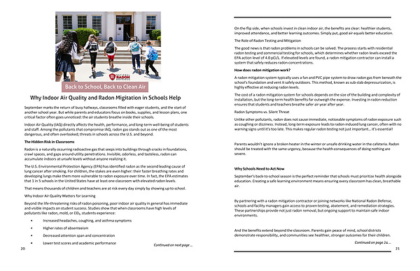 Indoor Air Quality( IAQ) directly affects the health, performance, and long‐term well‐being of students and staff. Among the pollutants that compromise IAQ, radon gas stands out as one of the most dangerous, and often overlooked; threats in schools across the U. S. and beyond.
