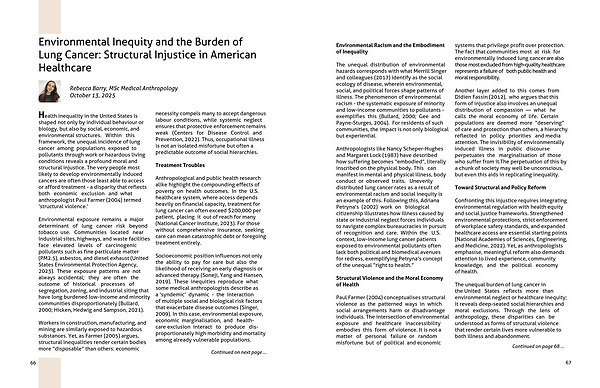 Anthropologists like Nancy Scheper-Hughes and Margaret Lock (1987) have described how suffering becomes “embodied”, literally inscribed on the physical body. This can manifest in mental and physical illness, body conduct or observed traits. Unevenly distributed lung cancer rates as a result of environmental racism and social inequity is an example of this. Following this, Adriana Petryna’s (2002) work on biological citizenship illustrates how illness caused by state or industrial neglect forces individuals to navigate complex bureaucracies in pursuit of recognition and care. Within the U.S. context, low-income lung cancer patients exposed to environmental pollutants often lack both political and biomedical avenues for redress, exemplifying Petryna’s concept of the unequal “right to health.”