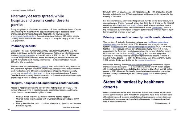 Meanwhile, federally funded community health centers have become slightly more accessible since 2021— at least for now. While over 71 million people still live in health center deserts today, this number is down from over 78 million people in 2021. However, funding for these health centers and programs that address primary care shortages are currently at risk due to federal policy changes.