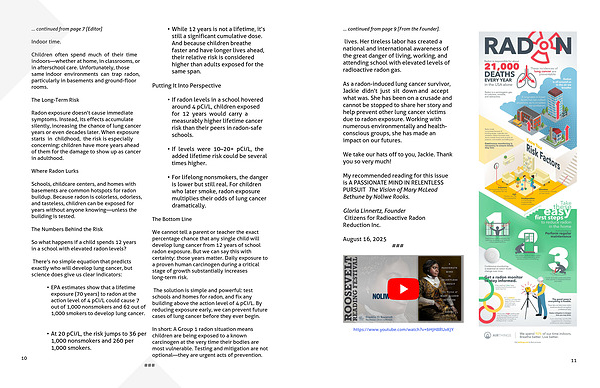 lives. Her tireless labor has created a national and international awareness of the great danger of living, working, and attending school with elevated levels of radioactive radon gas.
