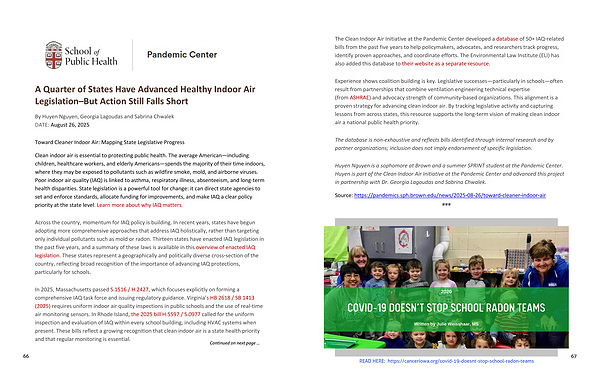 Across the country, momentum for IAQ policy is building. In recent years, statess have begun adopting more comprehensive approaches that addresss IAQ holistically, rather than targeting only individual pollutants such as mold or radon. Thirteen states have enacted IAQ legislation in the past five years, and a summary of these laws is available in this overview of enacted IAQ legislation. These states represent a geographically and politically diverse cross‐section IAQ protections, of the country, reflecting broad recognition of the importance of advancing particularly for schools.