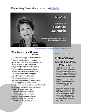 In 2006, Bonnie founded the Bonnie J. Addario Lung Cancer Foundation (ALCF)—to advance research, early detection, patient education, and to challenge the stigma surrounding lung cancer