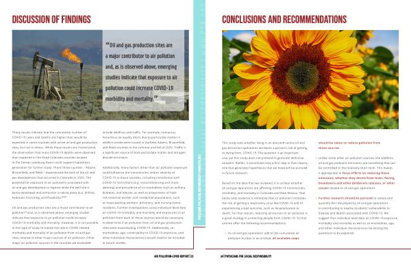 These results indicate that the cumulative number of COVID-19 cases and deaths are higher than would be expected in some counties with active oil and gas production sites , but not in others . While these results are inconclusive , the observation that more COVID-19 deaths were observed than expected in the three Colorado counties located in the Denver Julesburg Basin could support hypothesis generation for further study . Those three counties – Adams , Broomfield , and Weld – experienced the bulk of the oil and gas development that occurred in Colorado in 2020 . The potential for exposure to air pollutants associated with oil and gas development is highest while the well site is being developed and extraction is taking place ( e . g . drilling ,