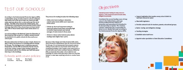 a nationwide survey of radon levels in schools estimates that nearly one in five has at least one classroom with radon exposure above the 4.0 picocuries per liter of air (pCi/L) --the EPA action level in the United States. The Southwestern Pennsylvania Environmental Health Project indicates that 69% of the schools have not been tested and 28% of those tested report radon levels above 4.0 pCi/L.