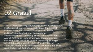 Stell dir die Geschwindigkeit, Leichtigkeit und Reaktivität eines Straßenlaufschuhs vor, kombiniert mit der Traktion und Stabilität eines Trailschuhs. Dazu kommt der weiche, gedämpfte Laufkomfort eines Hochleistungs- Straßenlaufschuhs – und fertig ist ein Gravel-Schuh. Auf Asphalt fühlt er sich nicht schwer oder klobig an wie ein herkömmlicher Trailschuh, und auf unbefestigten Wegen rutschst du nicht herum. Es ist der ultimative Hybrid – ein Schuh, der für die Art zu laufen entwickelt wurde, wie wir es natürlich tun: frei, flexibel und uneingeschränkt.