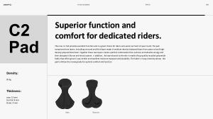 The new C2 Pad provides excellent function and is a great choice for riders who work out hard all-year round. The pad comprises three layers, including a second and third layer made of medium-density biobased foam from castor oil and highdensity polyurethane foam. Together these two layers create a perfect combination that cushions and absorbs energy and then dissipate it like an anti-shock system. In addition, the layer closest to the skin is made of top-quality recycled polyamide fabric that offers great 4-way stretch and excellent moisture transport and durability. The fabric’ s 4-way elasticity allows the pad to follow the moving body for optimal comfort and function.