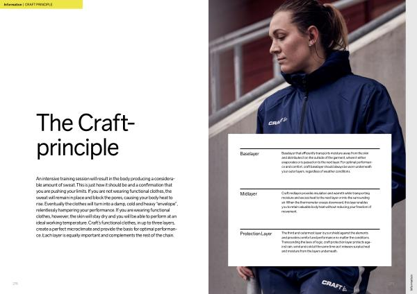An intensive training session will result in the body producing a considerable amount of sweat . This is just how it should be and a confirmation that you are pushing your limits . If you are not wearing functional clothes , the sweat will remain in place and block the pores , causing your body heat to rise . Eventually the clothes will turn into a damp , cold and heavy “ envelope ”, relentlessly hampering your performance . If you are wearing functional clothes , however , the skin will stay dry and you will be able to perform at an ideal working temperature . Craft ’ s functional clothes , in up to three layers , create a perfect microclimate and provide the basis for optimal performance . Each layer is equally important and complements the rest of the chain .