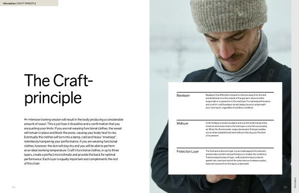 An intensive training session will result in the body producing a considerable amount of sweat. This is just how it should be and a confirmation that you are pushing your limits. If you are not wearing functional clothes, the sweat will remain in place and block the pores, causing your body heat to rise. Eventually the clothes will turn into a damp, cold and heavy“ envelope”, relentlessly hampering your performance. If you are wearing functional clothes, however, the skin will stay dry and you will be able to perform at an ideal working temperature. Craft’ s functional clothes, in up to three layers, create a perfect microclimate and provide the basis for optimal performance. Each layer is equally important and complements the rest of the chain.