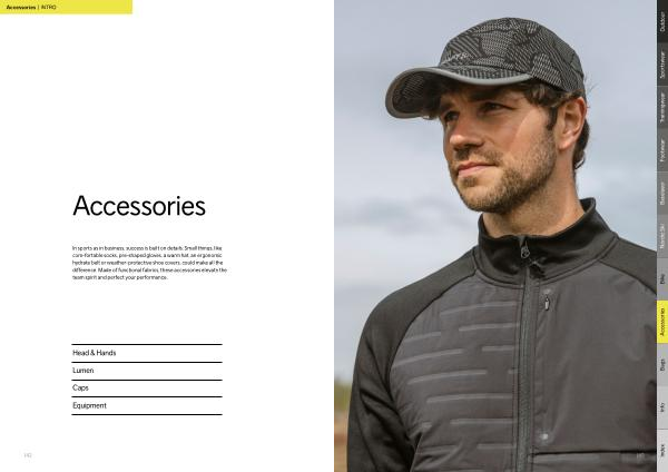 In sports as in business , success is built on details . Small things , like com-fortable socks , pre-shaped gloves , a warm hat , an ergonomic hydrate belt or weather-protective shoe covers , could make all the difference . Made of functional fabrics , these accessories elevate the team spirit and perfect your performance .