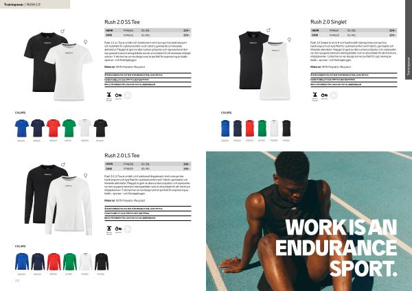 Rush 2.0 SS Tee är en lätt och funktionell t-shirt som ger bra fukttransport och kyleffekt för optimal komfort vid friidrott, gymnastik och liknande aktiviteter. Plagget är gjort av återvunnen polyester och representerar den nya generationens träningskläder som är utvecklade för att minimera miljöpåverkan. T-shirten har en ren design som är perfekt för exponering av klubb-, sponsor- och företagsloggor.