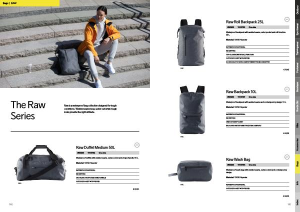 Raw is a waterproof bag collection designed for tough conditions . Welded seams keep water out while rough looks provide the right attitude .