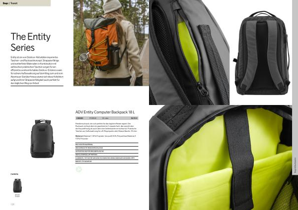 Entity ist ein von Outdoor-Aktivitäten inspiriertes Taschen- und Rucksackkonzept. Strapazierfähige und wetterfeste Materialien in Kombination mit zahlreichen praktischen Taschen sorgen für ein effizientes und komfortables Outdoor-Erlebnis sowie für sichere Aufbewahrung auf dem Weg zum und vom Abenteuer. Darüber hinaus eignet sich diese Kollektion aufgrund ihrer Strapazierfähigkeit auch perfekt für den täglichen Weg zur Arbeit.