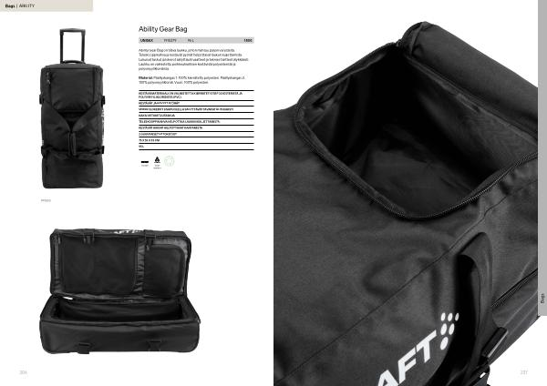 Ability Gear Bag on tilava laukku, johon mahtuu paljon varusteita. Teleskooppikahva ja kestävät pyörät helpottavat laukun kuljettamista. Lukuisat taskut ja lokerot säilyttävät vaatteet ja tekniset laitteet älykkäästi. Laukku on valmistettu poikkeuksellisen kestävistä polyesteristä ja polyvinyylikloridista.