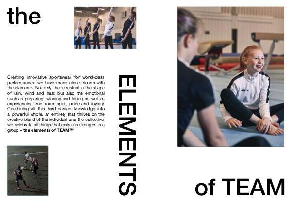 the ME Creating innovative sportswear for world-class performances, we have made close friends with the elements. Not only the terrestrial in the shape of rain, wind and heat but also the emotional such as preparing, winning and losing as well as experiencing true team spirit, pride and loyalty. Combining all this hard-earned knowledge into a powerful whole, an entirety that thrives on the creative blend of the individual and the collective, we celebrate all things that make us stronger as a group – the elements of TEAM™