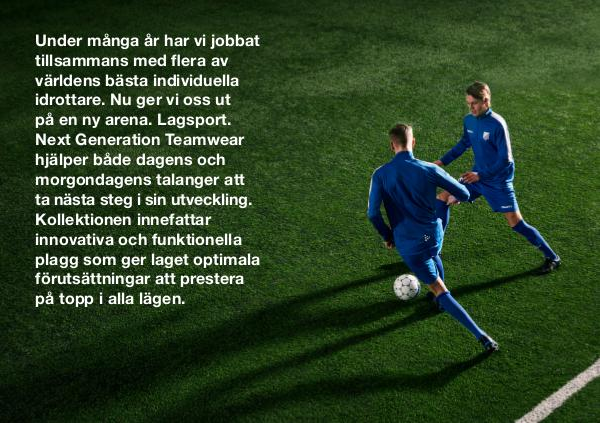Under många år har vi jobbat tillsammans med flera av världens bästa individuella idrottare. Nu ger vi oss ut på en ny arena. Lagsport. Next Generation Teamwear hjälper både dagens och morgondagens talanger att ta nästa steg i sin utveckling. Kollektionen innefattar innovativa och funktionella plagg som ger laget optimala förutsättningar att prestera på topp i alla lägen.